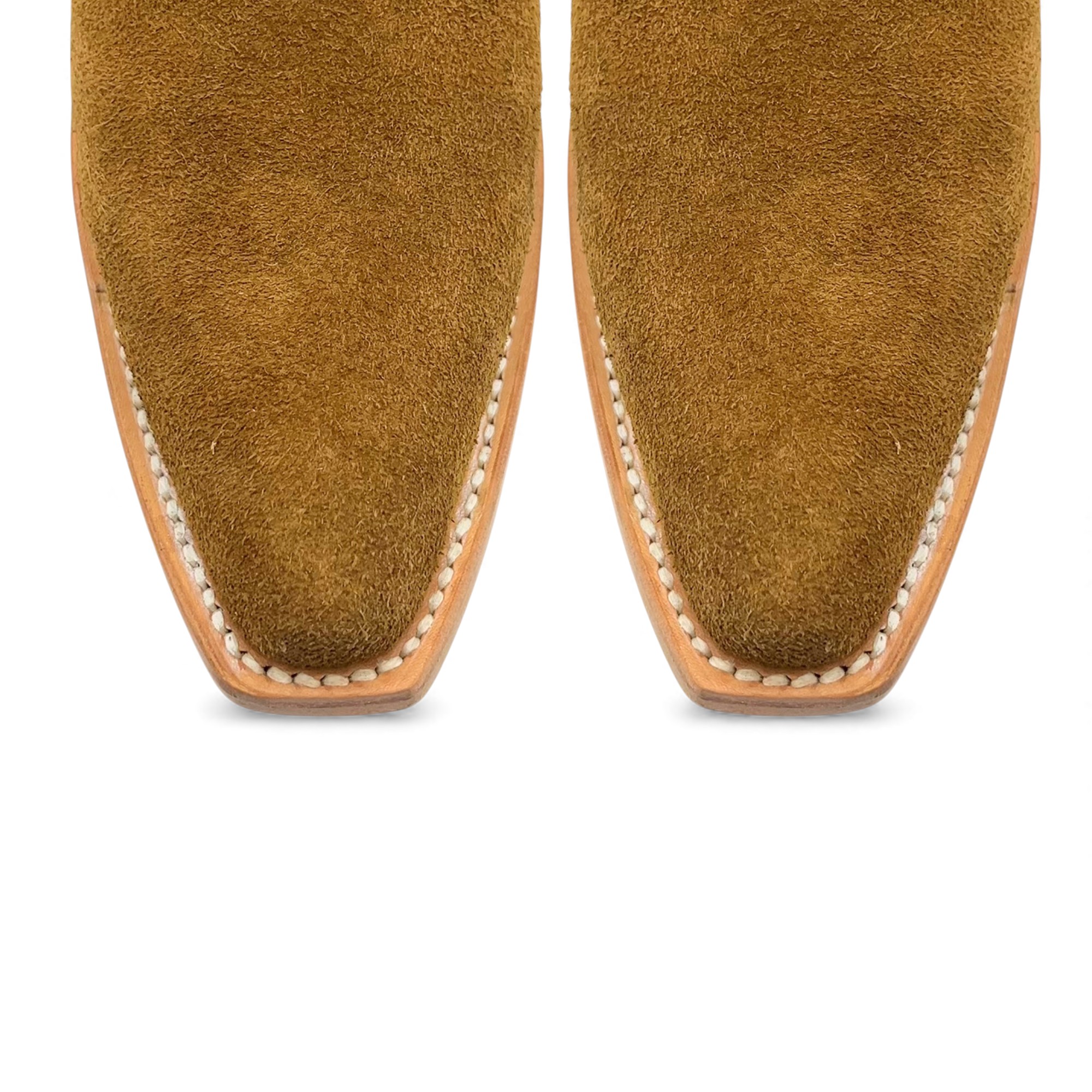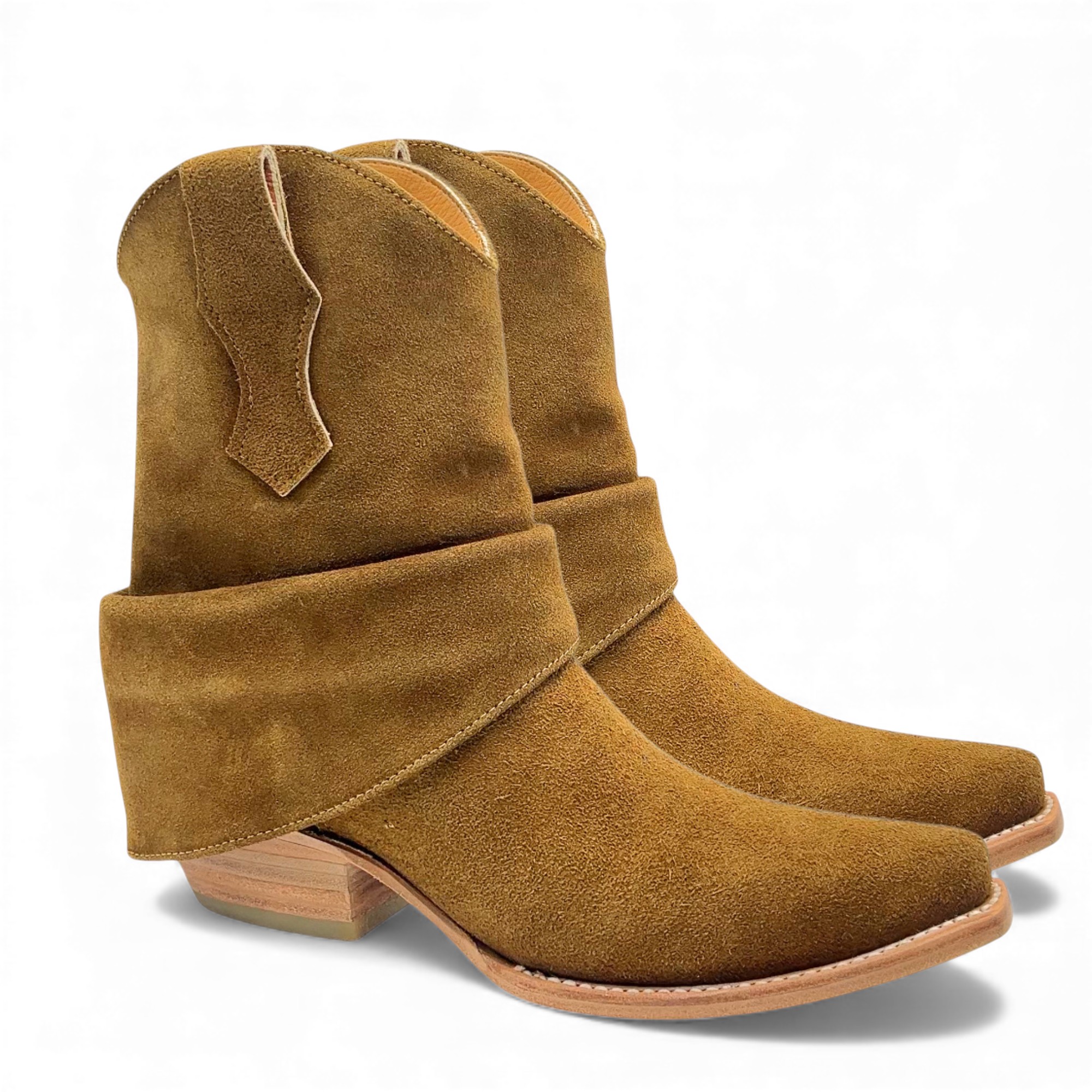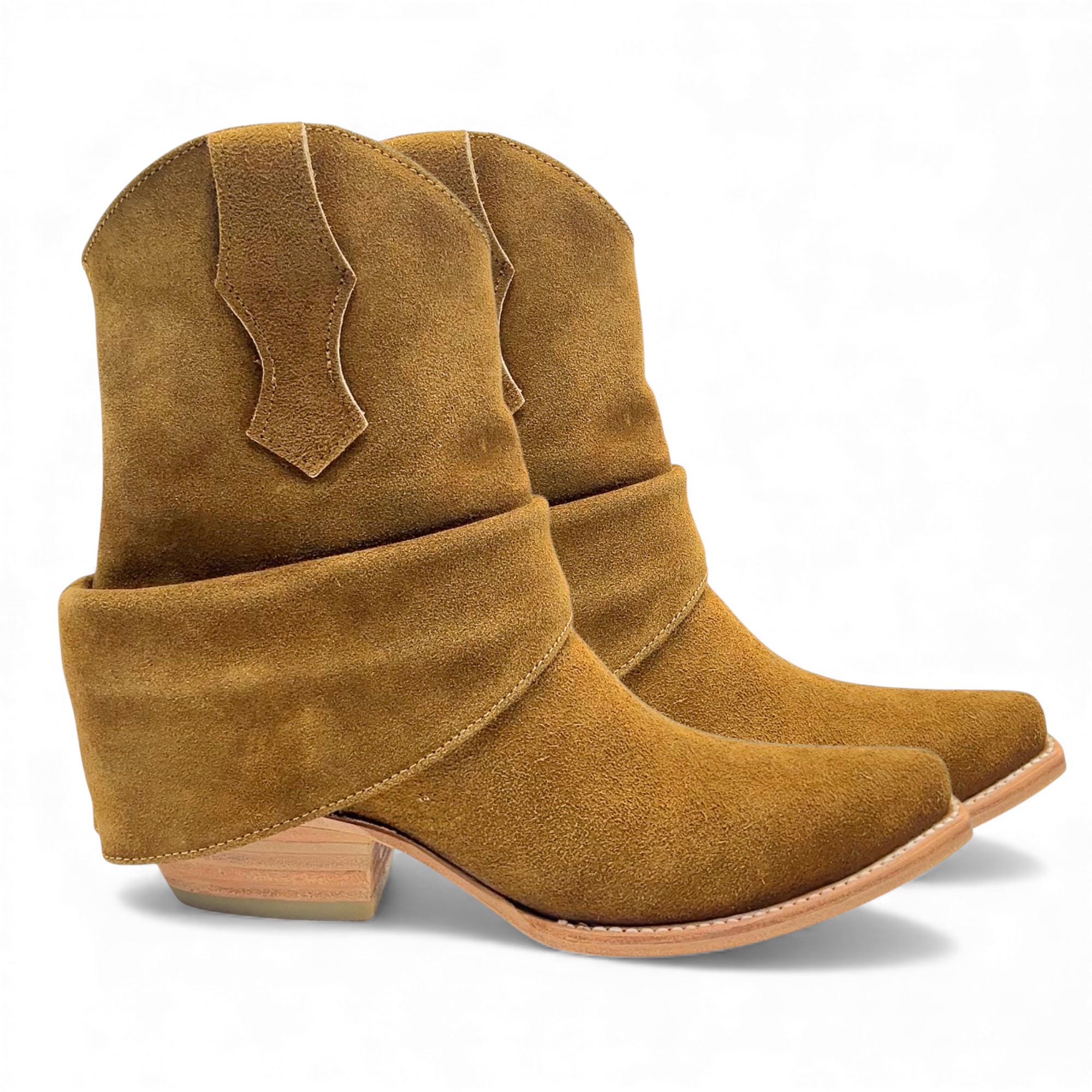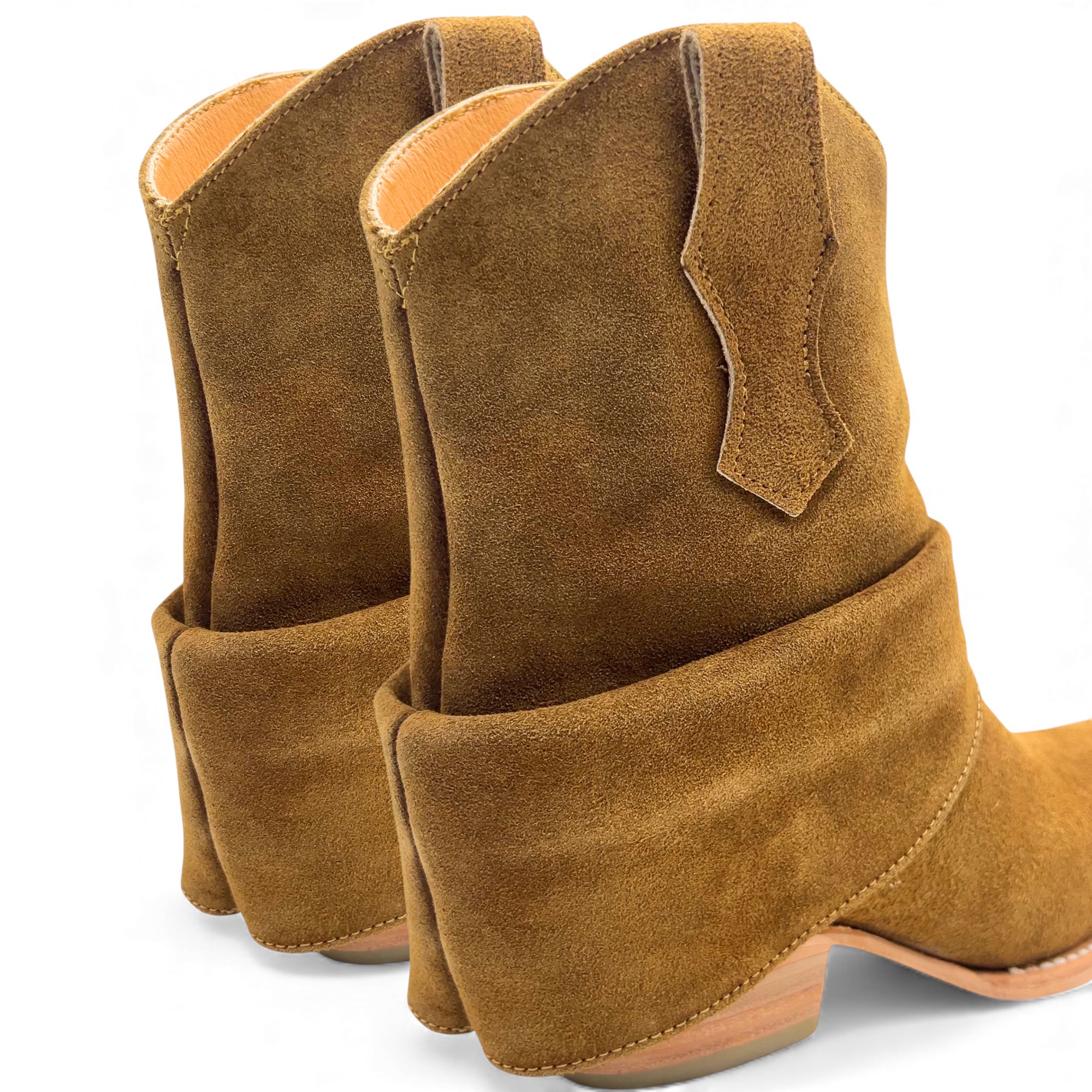 bota de gamuza, diseño holgado con caña caída y tacón bajo (4-5 cm) de madera, suela de cuero cosida. Comodidad y estilo con esencia vaquera.