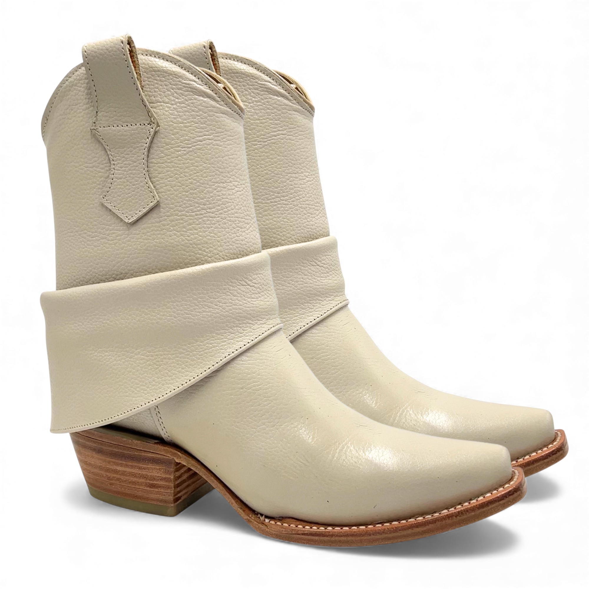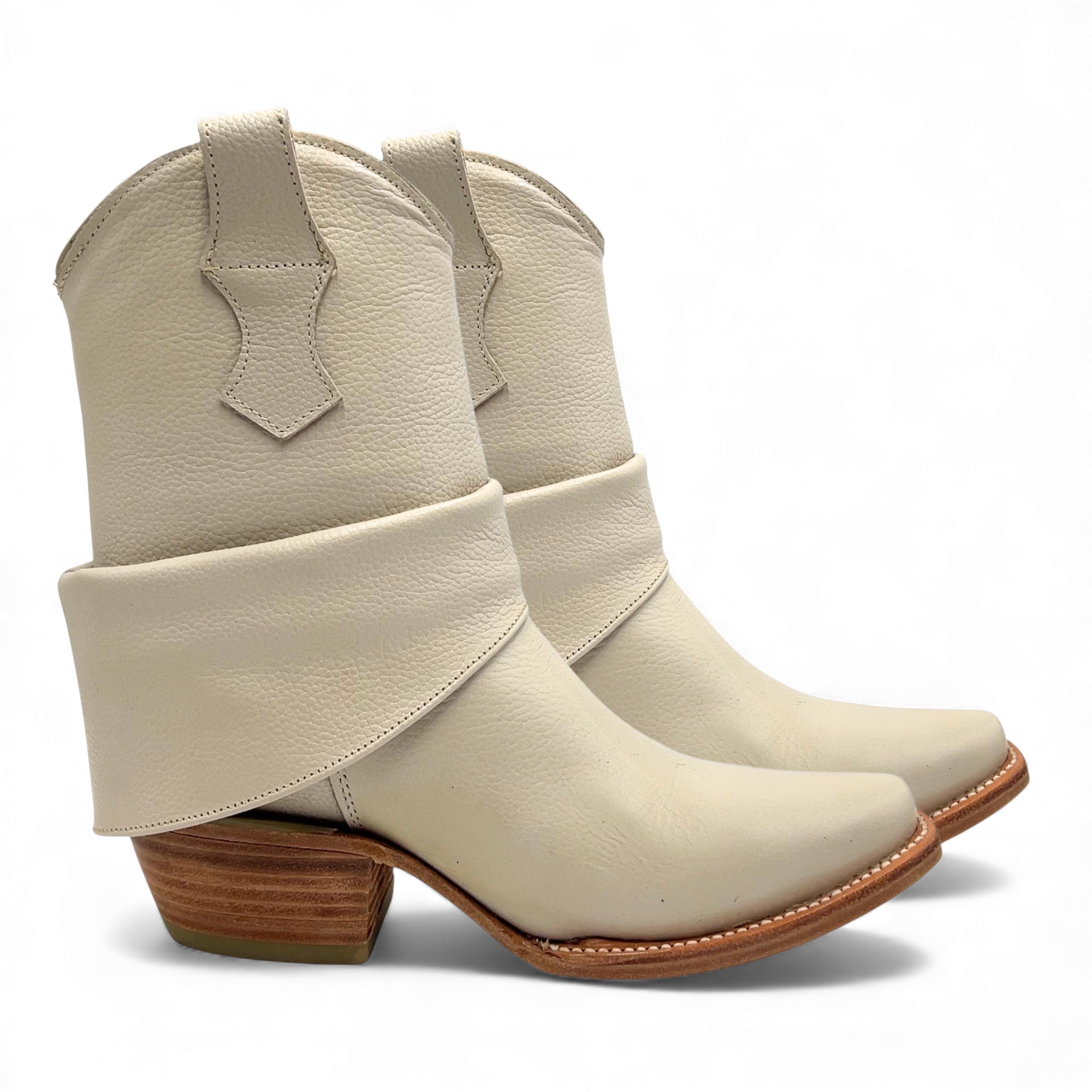 bota de 100% piel de res, diseño holgado con caña caída y tacón  bajo (4-5 cm) de madera, suela de cuero cosida. Comodidad y estilo con esencia vaquera.